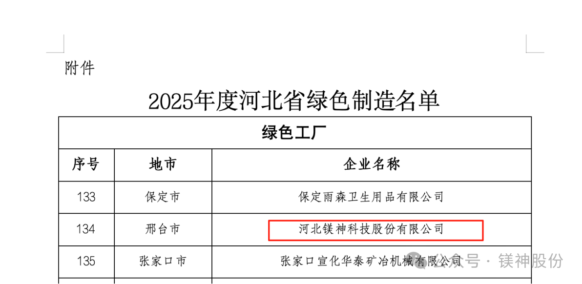 新聞摘要:2025年9月8日,河北省工業和信息化廳正式公布了2025年河北省綠色制造名單。河北鎂神科技股份有限公司(以下簡稱“鎂神科技”)憑借在綠色制造、節能降耗、清潔生產等方面的突出表現,成功入選“2025年度河北省綠色制造名單”!這是公司積極踐行綠色發展理念、扎實推進綠色體系建設取得的重大成果,也是對鎂神科技綠色制造水平和可持續發展能力的認可!